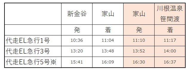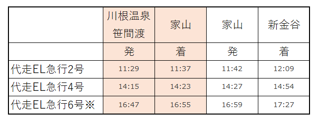 EL代走列車につきましては「運賃+SL・EL急行料金」にてご乗車いただけます。なお、11/7は新金谷⇔家山間での運転となります。