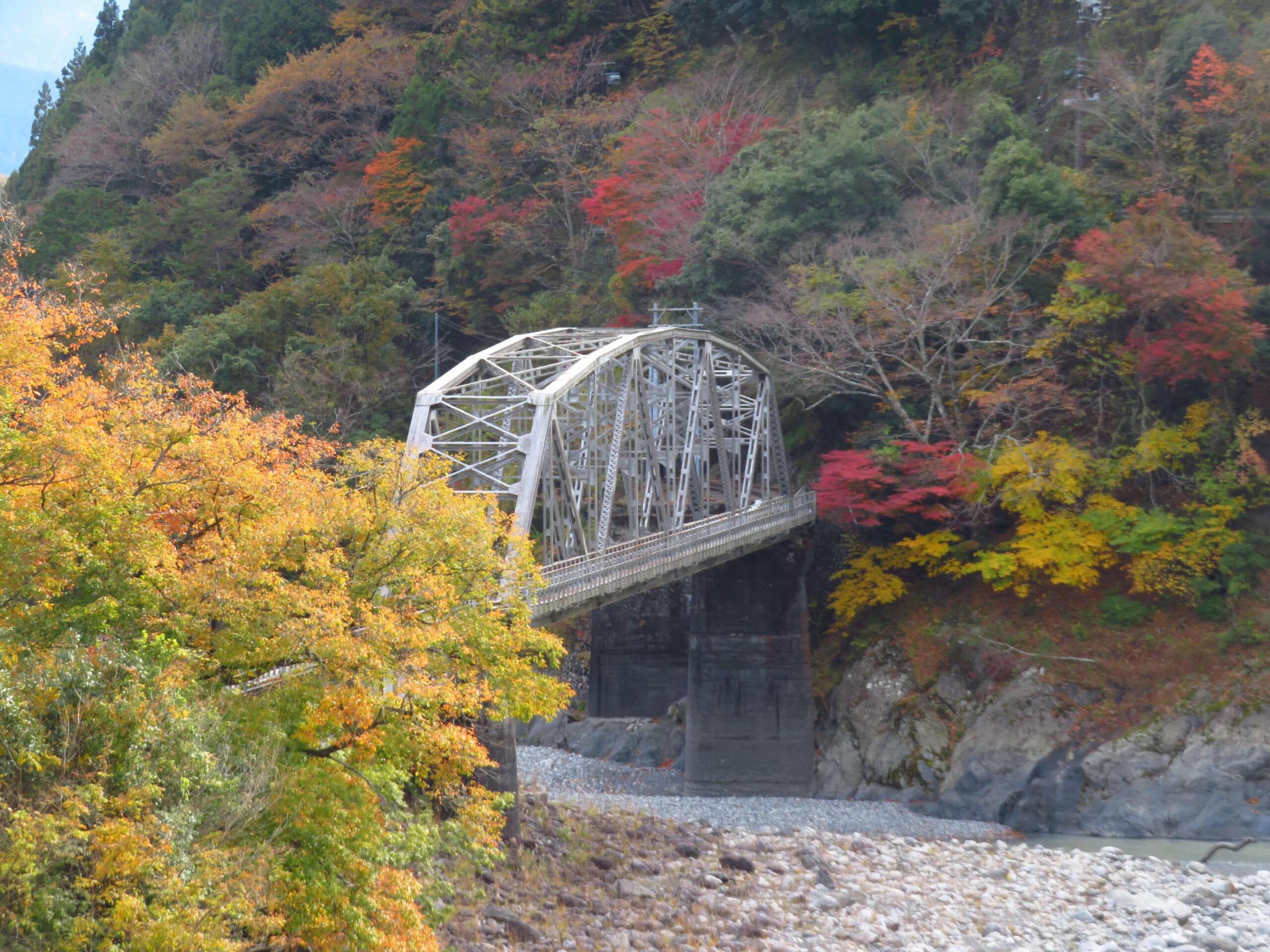 列車が鉄橋を渡る際には徐行運転となり、窓からゆったりと紅葉狩りを楽しめる特別な瞬間に出会えるポイントです。川面に映る紅葉をお見逃しなく。