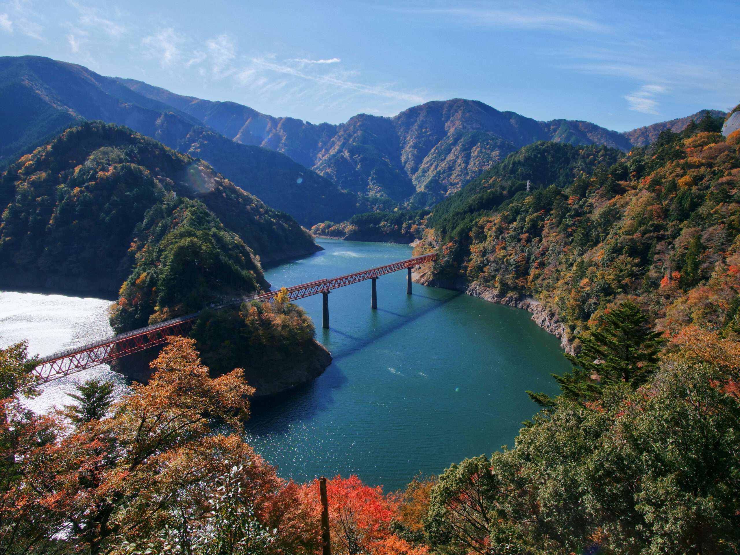 鉄道日本一急な坂道を上り下りする区間は、車窓から紅葉を楽しめる絶景ポイントでもあります。長島ダム駅で下車して、色とりどりの景色の中を上り下りする列車をカメラに収めるのもよし!