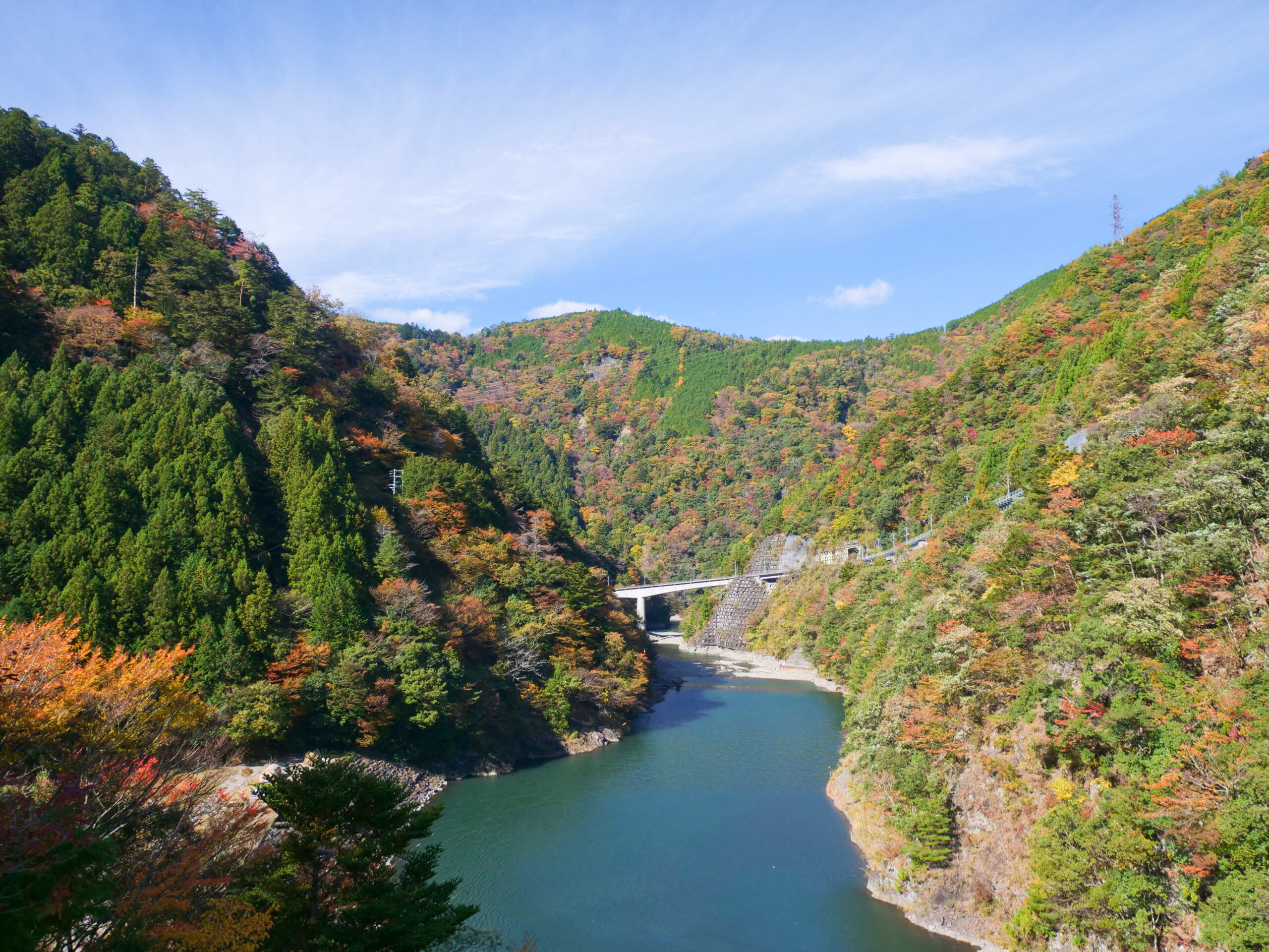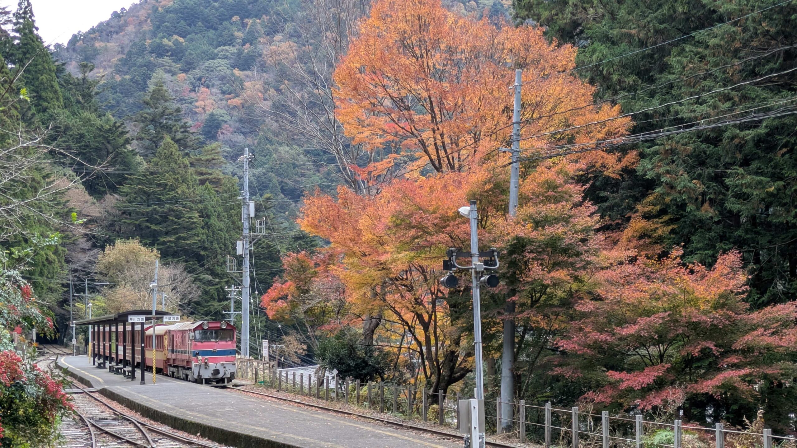 奥大井湖上駅からひと駅先、接岨峡温泉周辺の紅葉も鮮やかさを増し、見ごろを迎えつつあります。