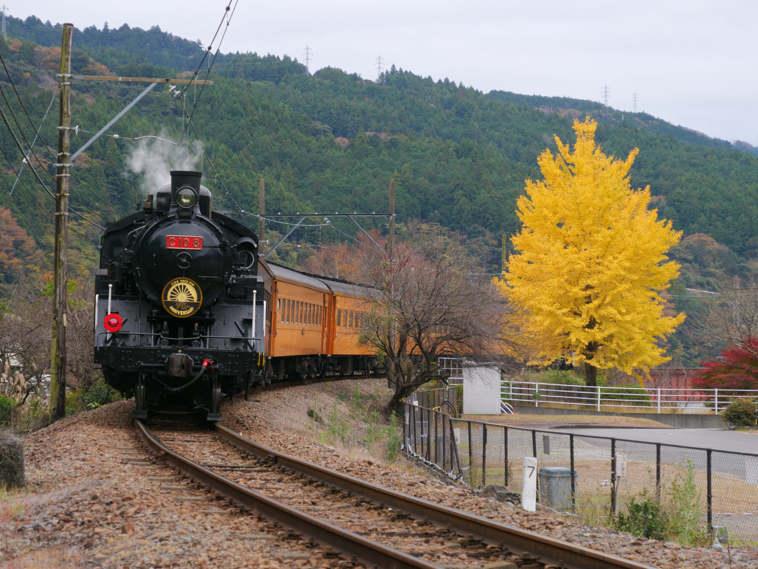 レトロな列車と色づく山々のコントラストは、まさにSNSにアップしたくなる絶景。