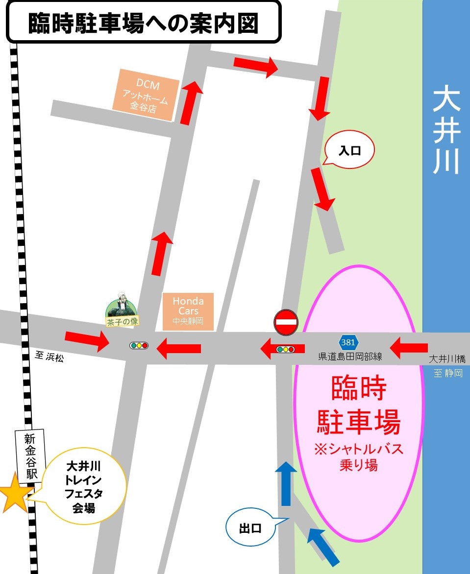 ・大井川河川敷臨時駐車場をご利用ください(無料シャトルバスあり) ・金谷駅⇔新金谷駅間で臨時列車を運転します |