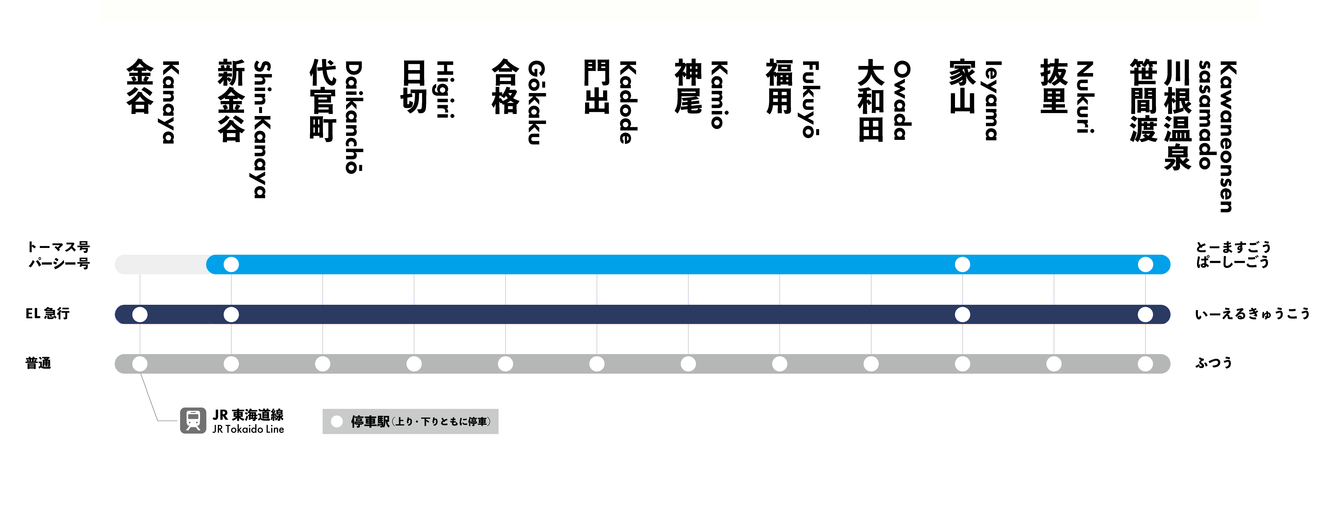 || 経由なし = 列車・バスは、他の経路を通るため、この駅には停車しません。