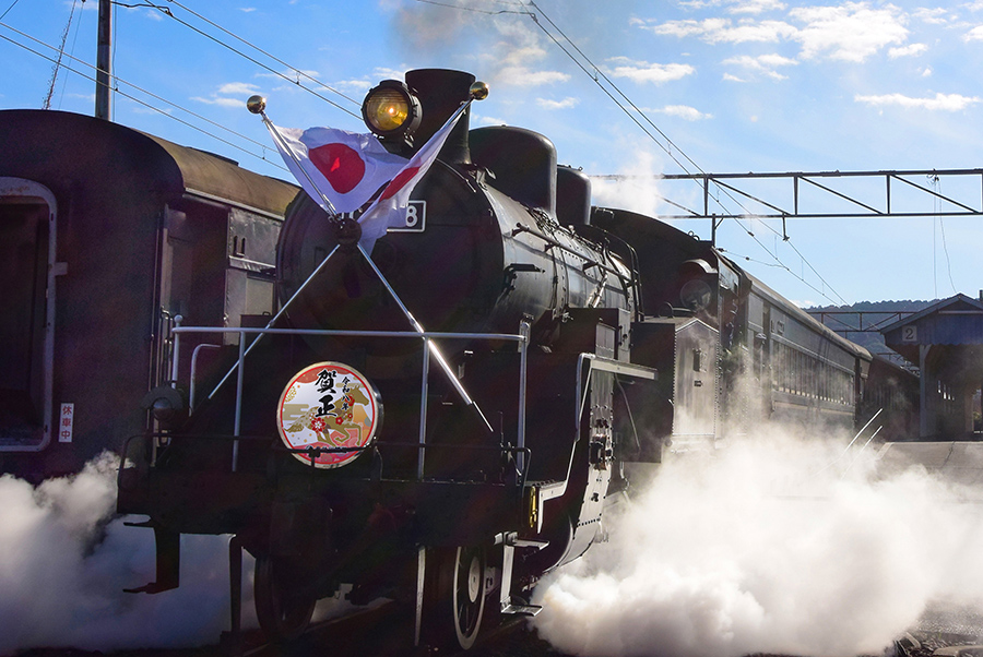 2025(令和7)年11月28日(金)から11月30日(日)までと、2026(令和8)年1月1日(木・祝)から1月3日(土)までの計6日間、SLに賀正ヘッドマークおよび日章旗(一部の日は日章旗のみ)を装着して運転いたします。